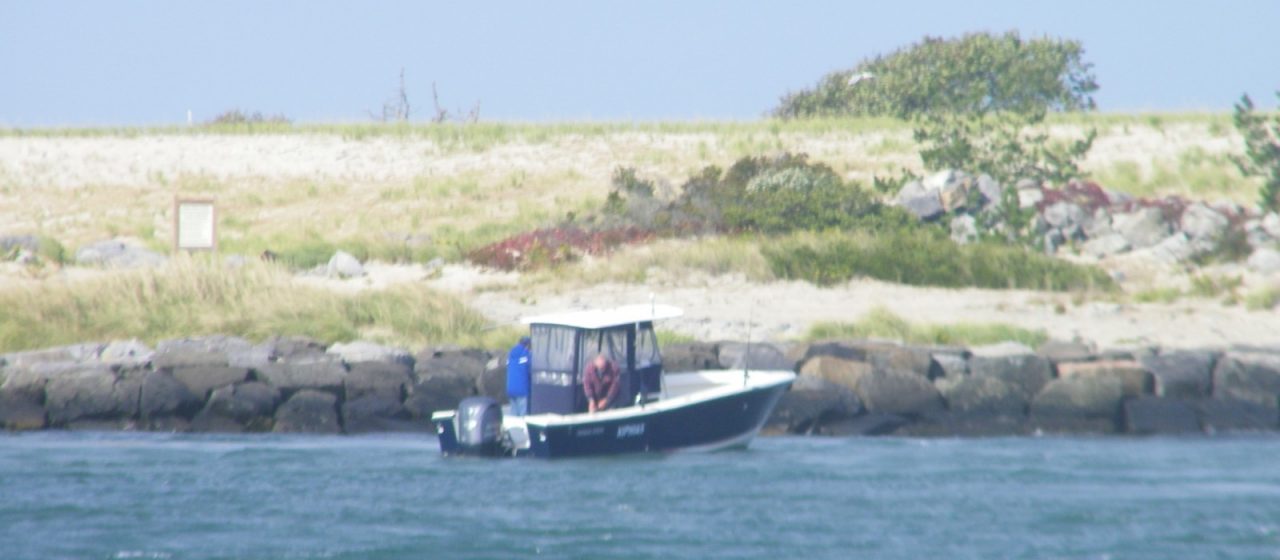 The crescent-shaped archipelago is a sand bar that looks like a horseshoe. The color of the water attests to shallows and deeps. Mark witnessed a feeding frenzy with gulls and cormorants feeding on bunker. Later, when I looked at this island, I saw dark pinpoints of roosting birds who are taking advantage of the proximity of plentiful food. All this variety creates different sized waves and eddies. This all adds up to a very interesting bayscape.