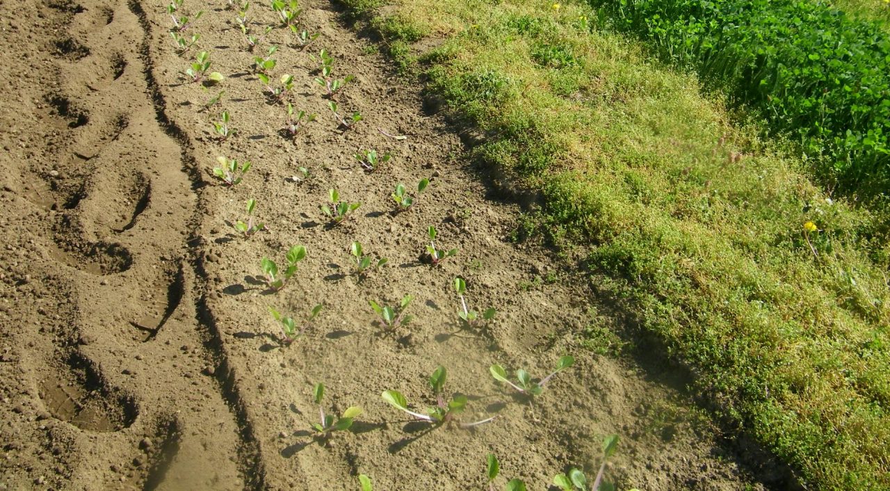 Don is the farmer. The garlic bed is one of the newest. Starting from grass turf, the ground was turned over, and disked twice. It was planted with sorghum last fall to increase organic content. Later last fall, an expensive cover of good strong compost was laid down to start the 12 beds.